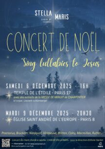 Nous avons le très grand bonheur de vous convier à nos concerts de Noël, ce samedi 6 décembre à 16h au Temple de l’Etoile, et ce mardi 9 décembre à 20h30 en l’église Saint-André de l’Europe.
